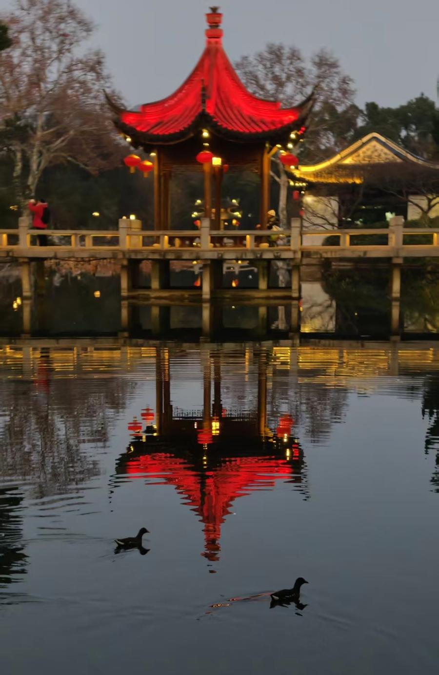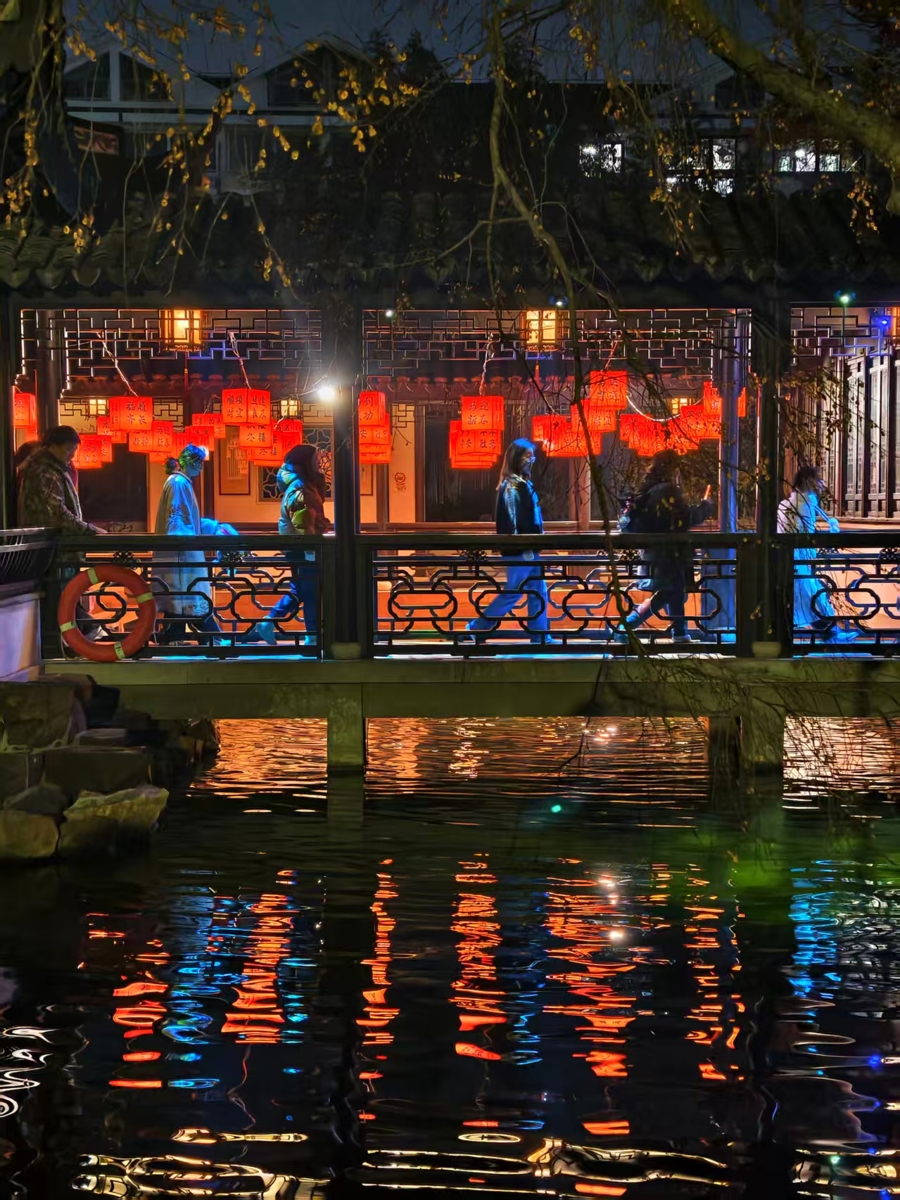 此外,园内还有多处“氛围组”花灯,包括长廊里、九曲桥边的灯笼阵等,交汇成一幅流光溢彩的画卷。