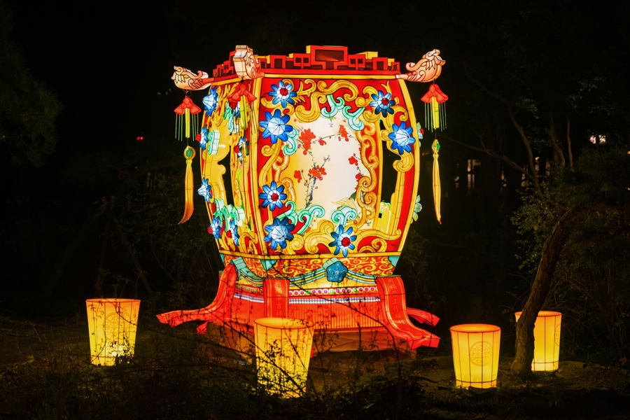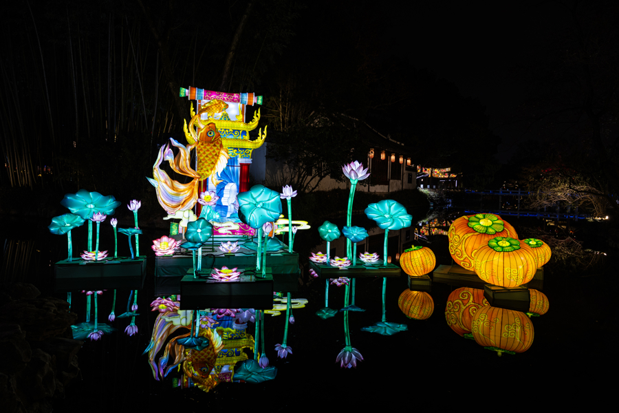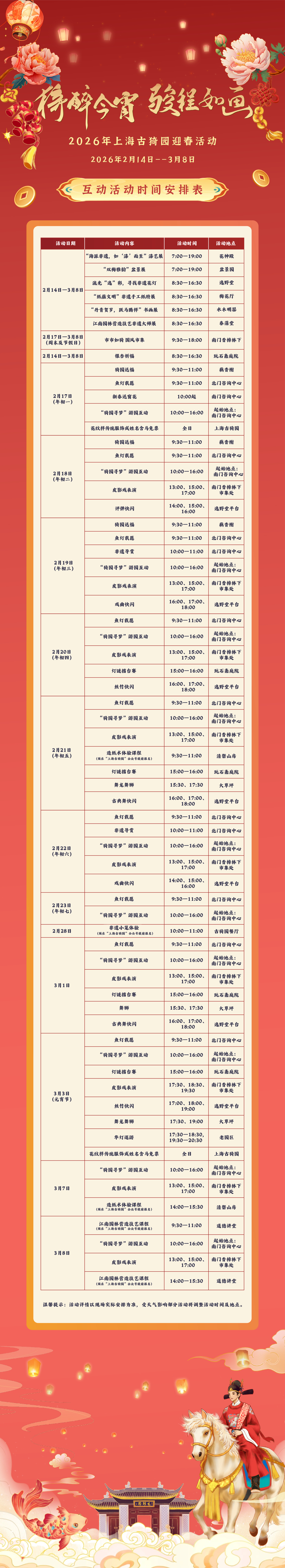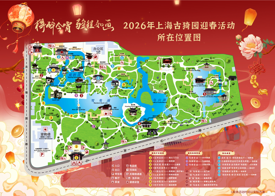 春节及元宵时间,园内各处将轮替献艺舞龙舞狮、皮影戏、非遗戏曲、江南丝竹等非遗国潮扮演,搭配华灯巡游,扯后腿特出。此外,书道送福、“鱼灯载愿”互动、祝愿迎新等当作也将令旅客感受传统年俗的喜庆。